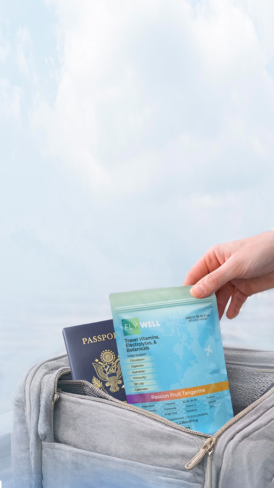 Flywell is a travel-specific hydration + vitamin system designed to combat jet lag, dehydration and immune stress - before they hit.